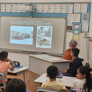Depois do almoço, o avô do Tomás Moreira, o Sr. Manuel veio à sala do seu neto, ao 2ºA, contar na 1ª pessoa como viveu o dia 25 de abril. Preparou um PowerPoint com os seus retalhinhos de vida. Foram muitas as emoções vividas naquelas quatro paredes.