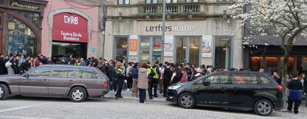 Os estudantes, distribuídos pelos autocarros, foram chegando ao Teatro Sá da Bandeira, onde todos esperaram até entrarem. No Teatro Sá da Bandeira, a sala mais antiga com atividade contínua é também conhecida pela sua beleza e o seu interior surpreendeu os alunos que nele entravam, desde as paredes e as máscaras, com as diferentes expressões, até aos camarotes e à sua dimensão. Por turmas, sentaram-se e esperaram o início do teatro, posto em cena pelo grupo Teatro Actus, numa adaptação do Auto da Barca do Inferno.